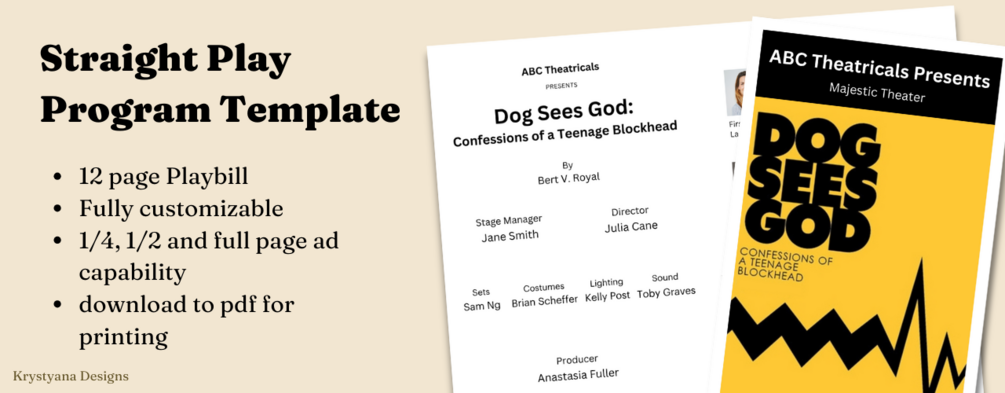Elevate your next production with this 12-page customizable program template! Designed for straight plays, this template allows you to create polished and professional programs with ease, perfect for impressing your audience.