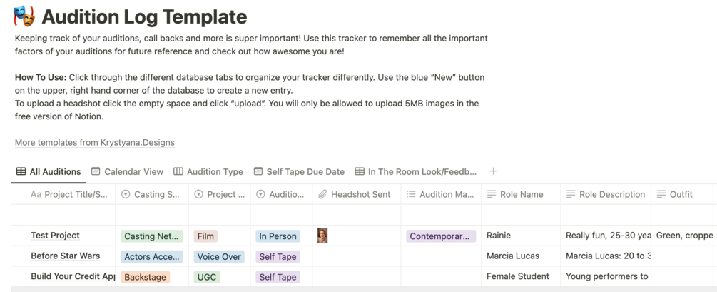 Keeping track of your auditions, callbacks, and other key details is vital for any actor! This Notion template helps you organize all your audition details in one place, making it easy to reflect on your progress and celebrate your wins.